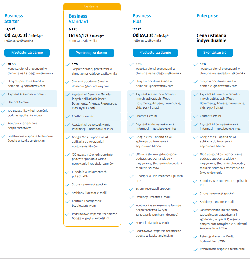 Przedsiębiorstwa, które na co dzień korzystają z pakietu, do przechowywania firmowych danych (takich jak dokumenty, arkusze, prezentacje, zdjęcia, filmy czy emaile) wykorzystują Dysk Google. W zależności od wybranego planu subskrypcji, mają do zagospodarowania od 30 GB do 5 TB miejsca na dane na każdą opłaconą licencję. Warto zauważyć, że stanowi to znaczącą różnicę w porównaniu do jedynie 15 GB miejsca dostępnego w prywatnym Gmailu. Dodatkowo, jeśli zajdzie taka potrzeba, firmy korzystające z planów Enterprise mogą ubiegać się o dodatkowe miejsce na dysku już w ramach wykupionych pakietów.