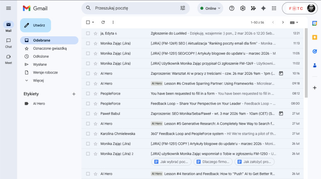 Naszym zdaniem najbezpieczniejszą i najbardziej wszechstronną usługę poczty elektronicznej oferuje Gmail w Google Workspace. W FOTC korzystamy z Google Workspace od wielu lat i pomagamy wdrażać to rozwiązanie w firmach na terenie Polski i Europy. W poczcie Gmail można łatwo założyć maila firmowego z własną domeną, a użytkownicy mają możliwość skorzystania z różnych opcji – zarówno darmowej poczty w wersji próbnej, jak i pełnych planów biznesowych. Gmaila szczególnie cenimy za: