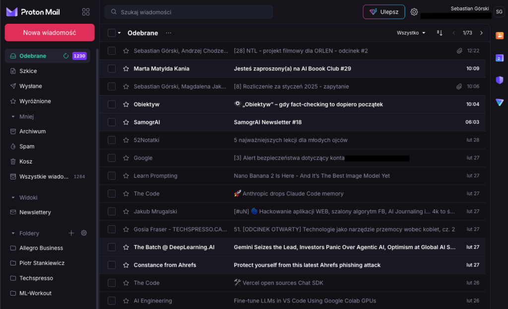 Jeżeli zależy Ci przede wszystkim na maksymalnym bezpieczeństwie korespondencji, Proton Mail jest naturalnym wyborem. Ta szwajcarska firma oferuje szyfrowane skrzynki pocztowe zarówno dla firm, jak i dla osób prywatnych, a dodatkowo korzysta z otwartego kodu źródłowego, co zwiększa transparentność i bezpieczeństwo usługi. W dobie Gmaila z Gemini 3 i Outlooka z Copilotem, Proton jako jedyna platforma z czołówki oferuje asystenta AI, który nie ma dostępu do treści Twoich maili.