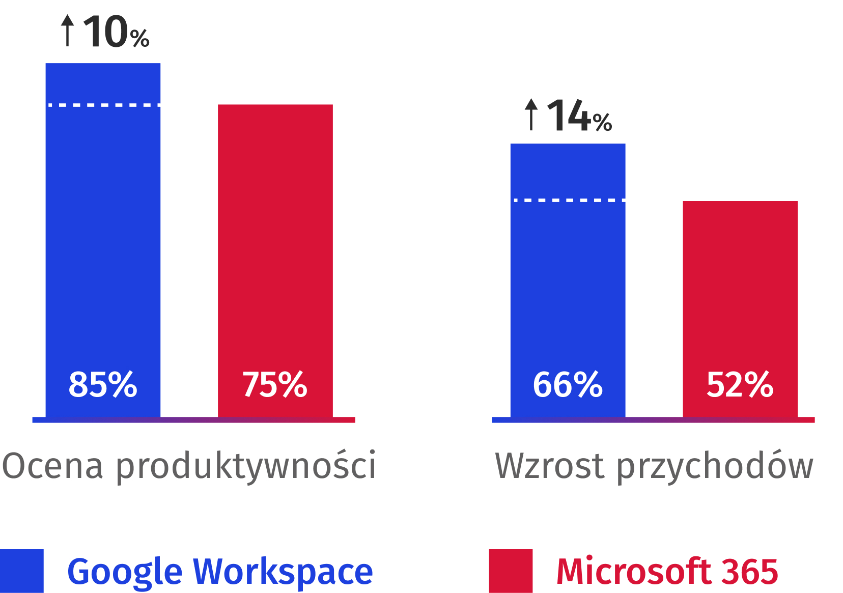 *Na podstawie 5-stopniowej skali. Wartości procentowe odzwierciedlają dwie najwyższe oceny w ankiecie, porównując użytkowników Google Workspace i Microsoft 365.