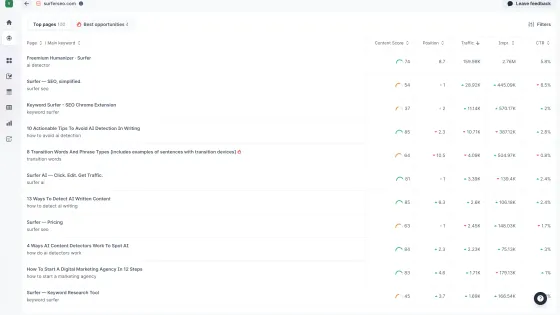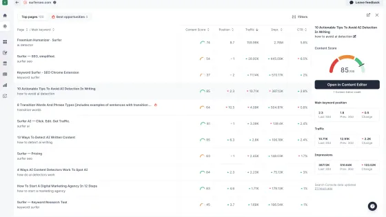 Zestaw narzędzi Surfera pomoże Ci w każdym aspekcie, od generowania gotowych do rankingu treści w ciągu kilku minut dzięki Surfer AI, przez wstawianie trafnych linków wewnętrznych jednym kliknięciem dzięki funkcji Auto Internal Links, po podnoszenie wyniku Content Score w kilka sekund dzięki funkcji Auto-Optimize, aż po publikowanie unikalnych treści, które pokochają Twoi odbiorcy dzięki funkcji Plagiarism Checker. Dzięki Sites jako centralnemu centrum, masz dostęp do wszystkich informacji, które kierują wszystkimi działaniami – od planowania i audytów treści po monitorowanie wydajności – wszystko w jednym miejscu.